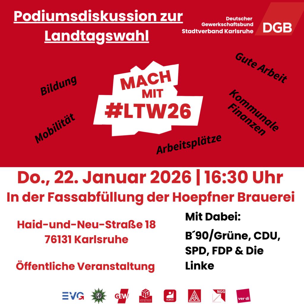 Der Stadtverband Karlsruhe des Deutschen Gewerkschaftsbundes lädt ein zu einer Podiumsdiskussion zur Landtagswahl. Es diskutieren die Kandidierenden und Vertreter*innen der Parteien Bündnis 90/DIE GRÜNEN, CDU, SPD, FDP und die Linke unter Anderem zu den Themen Bildung, Mobilität, Arbeitsplätze, und kommunale Finanzen.